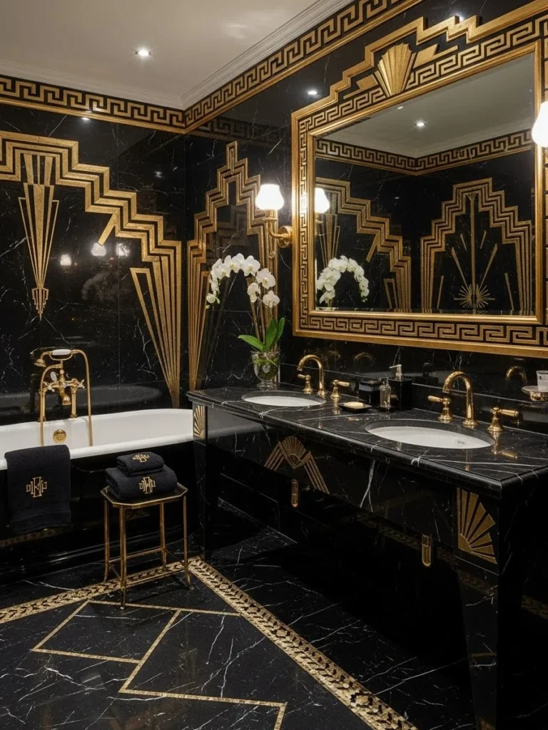 Cinematic lighting highlights patterns and metallic accents, emphasizing contrast and drama. The result is a statement bathroom that blends classic Art Deco style with contemporary 2026 sensibilities.