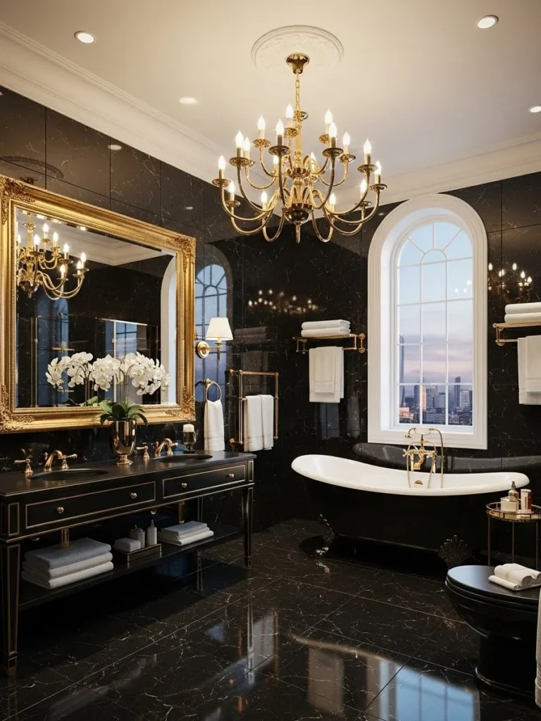 High ceilings allow this black bathroom to incorporate a gold chandelier as a dramatic centerpiece. The combination conveys grandeur and elegance.
