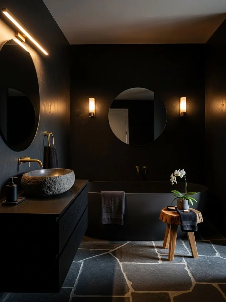 Black stone walls create a cocooning effect, offering intimacy and a spa-like retreat. The dark material feels grounded and timeless, providing the perfect backdrop for gold accents.