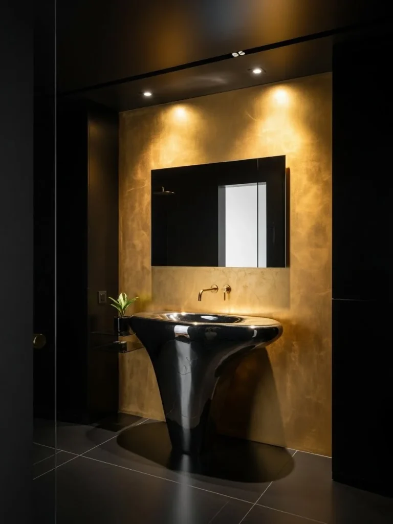 Matte gold faucets provide tactile contrast against the sleek black surfaces. Their subtle sheen reinforces a sense of luxury without overwhelming the composition. The combination feels modern, sophisticated, and balanced.