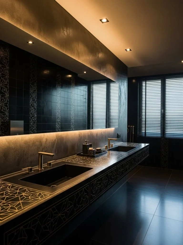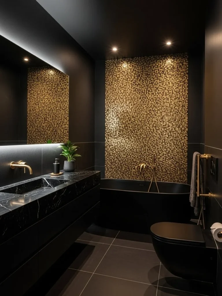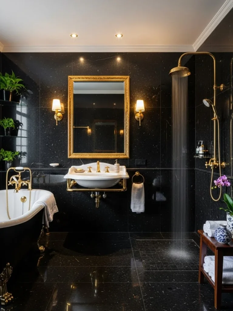 This bathroom draws inspiration from Art Deco elegance, blending black walls with geometric gold detailing. The design feels bold and glamorous, balancing dramatic color with refined metallic accents.