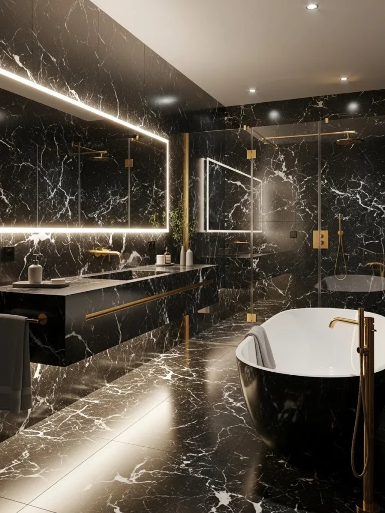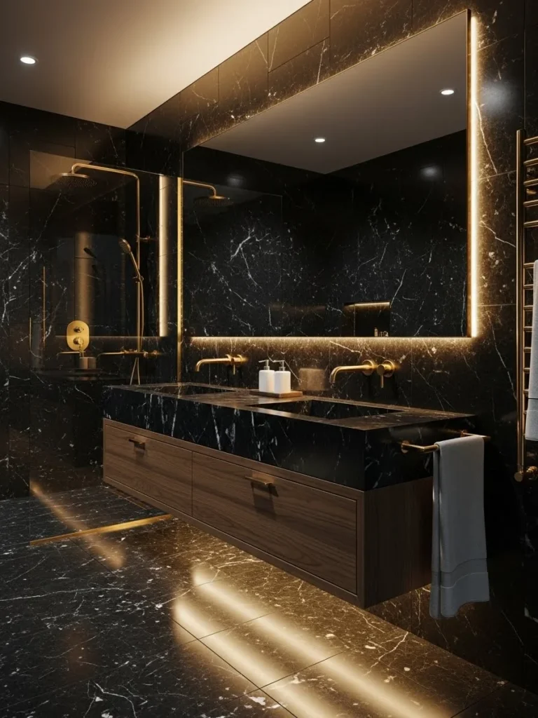 This luxury bathroom is defined by deep black marble that creates a dramatic, elegant foundation. The stone’s natural veining introduces subtle movement, preventing the dark palette from feeling flat. The continuous marble surfaces evoke high-end sophistication and timeless appeal.