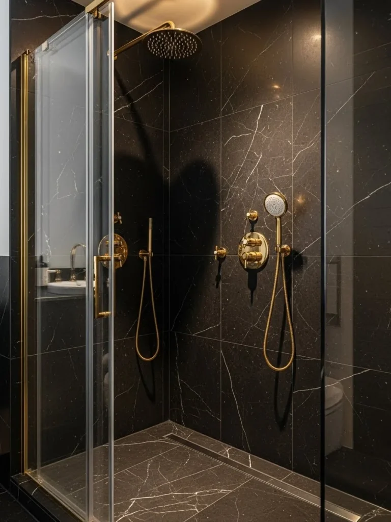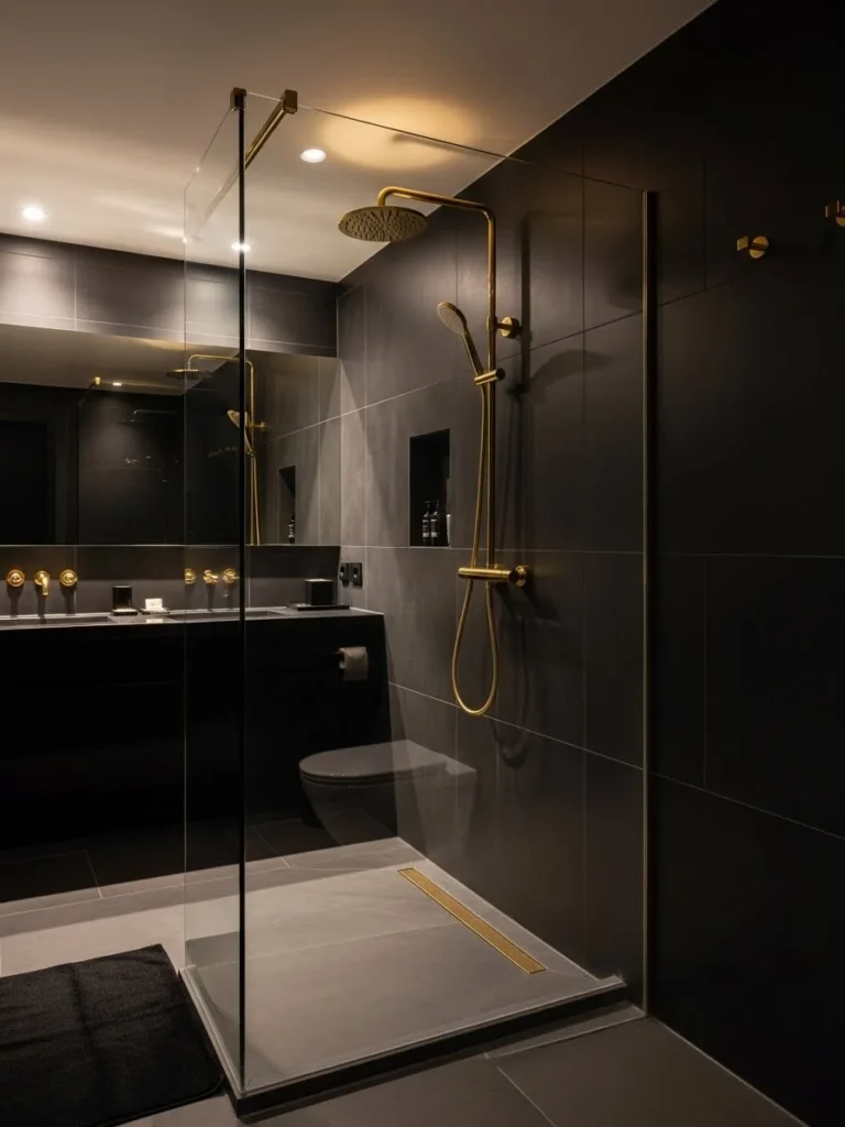Gold fixtures provide a warm contrast against the black surfaces. Faucets, shower hardware, and detailing feel polished and intentional. Their metallic warmth enhances the luxurious character without overpowering the space.