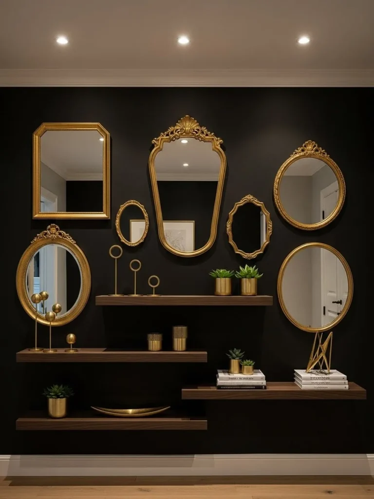 Floating shelves and minimal furnishings maintain balance and functionality. Surfaces are kept clean, emphasizing the mirrors and gold accents.