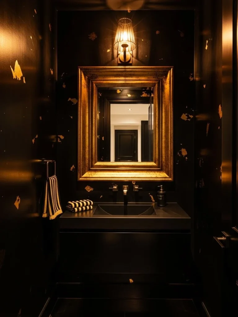 This bathroom features black walls paired with gold-framed mirrors, creating a refined and dramatic focal point. The mirrors amplify light and add architectural interest.