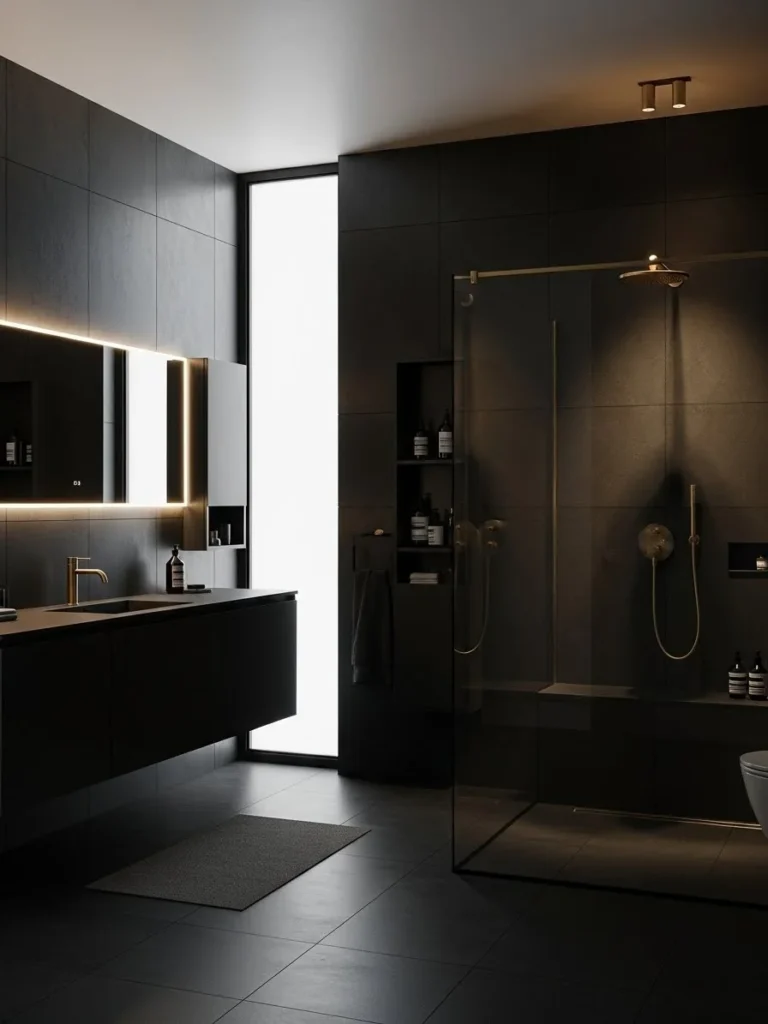 This minimalist bathroom uses black as a grounding base, creating depth and sophistication without overwhelming the space. Smooth surfaces and uncluttered layouts allow every element to breathe.