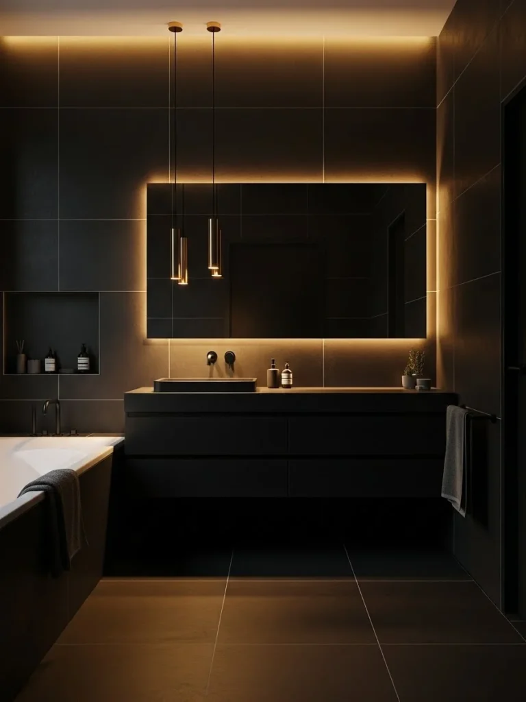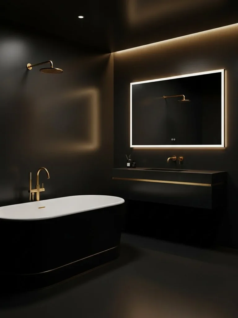 Gold wall sconces and faucets introduce warmth and refinement. Their soft glow enhances the spa-like mood while complementing the dark palette. The metallic elements feel curated and luxurious.