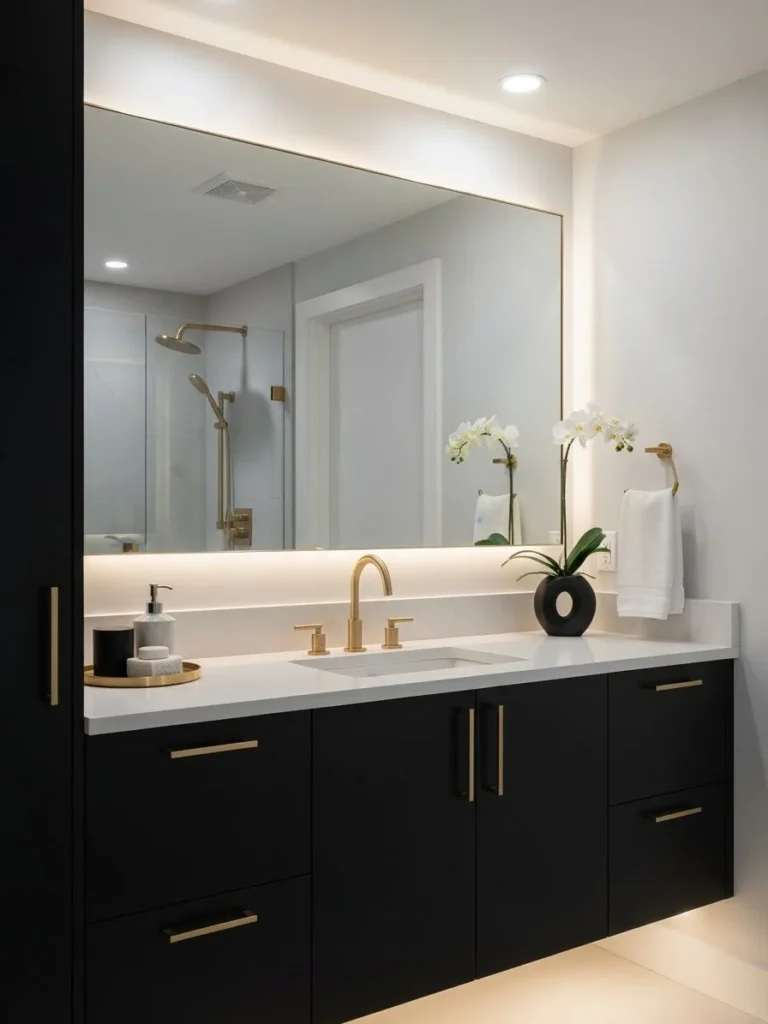 The surrounding space remains minimal, allowing the vanity to shine. Combined with layered illumination, the bathroom feels refined, polished, and fully aligned with luxury interior trends.
