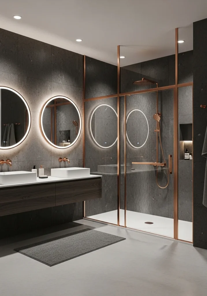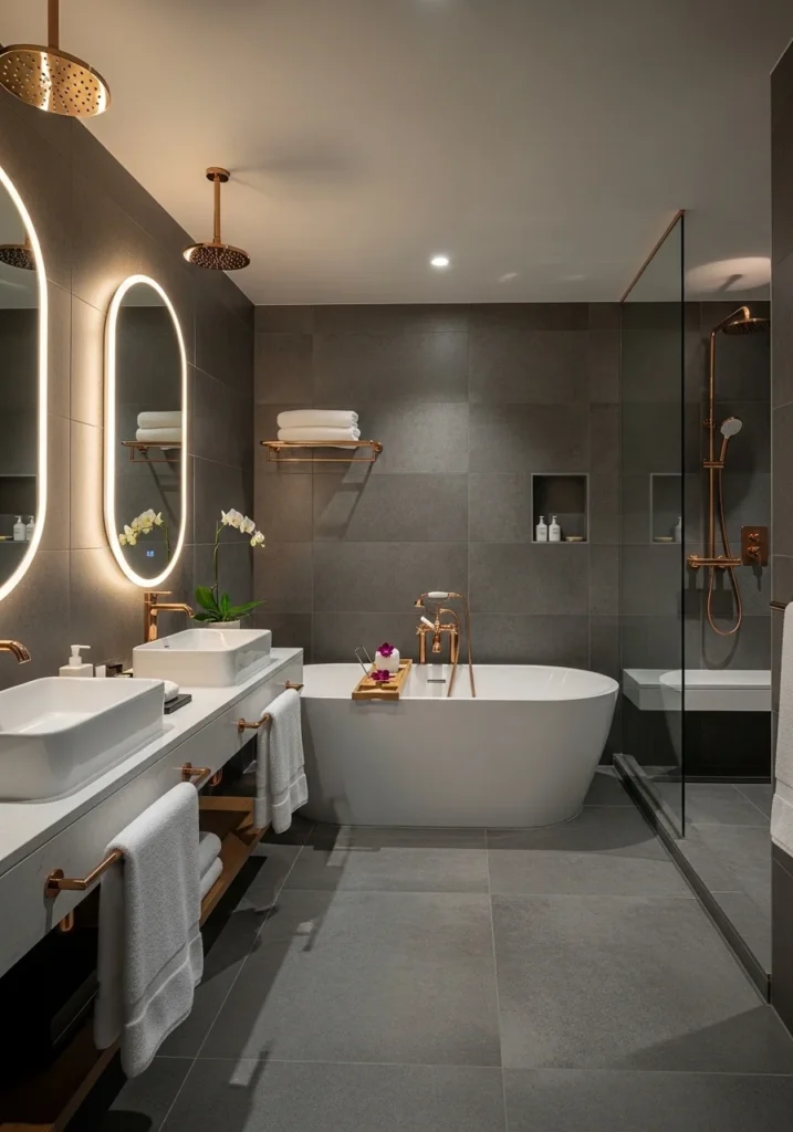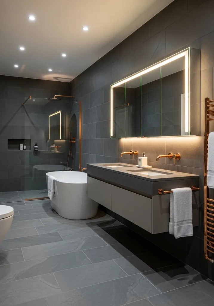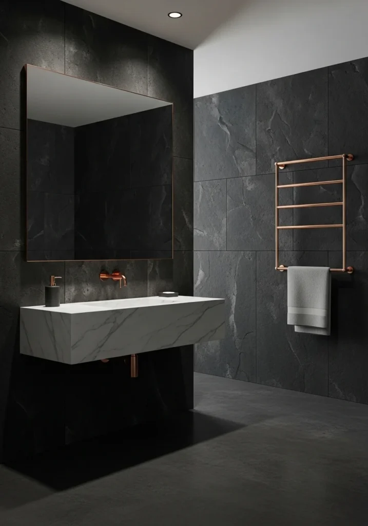 This design blends modern simplicity with elegant detailing. Charcoal tiles deliver structure and sophistication, while rose gold lighting and fixtures introduce warmth and glamour. The overall result is a balanced and stylish bathroom environment suited for contemporary luxury homes.