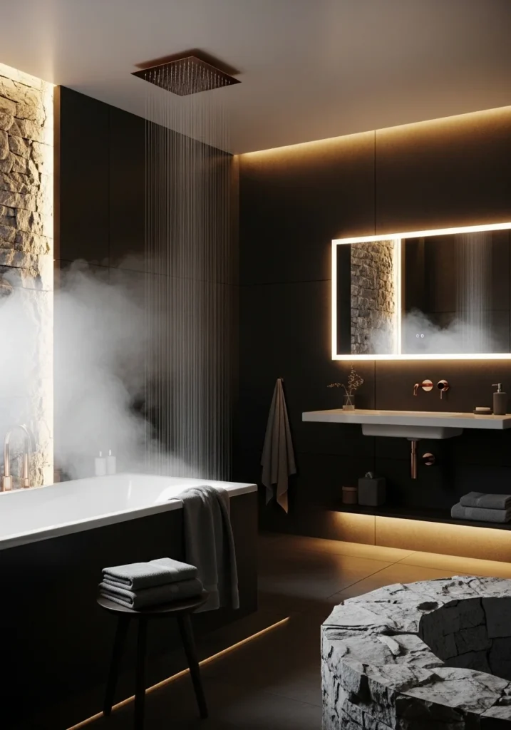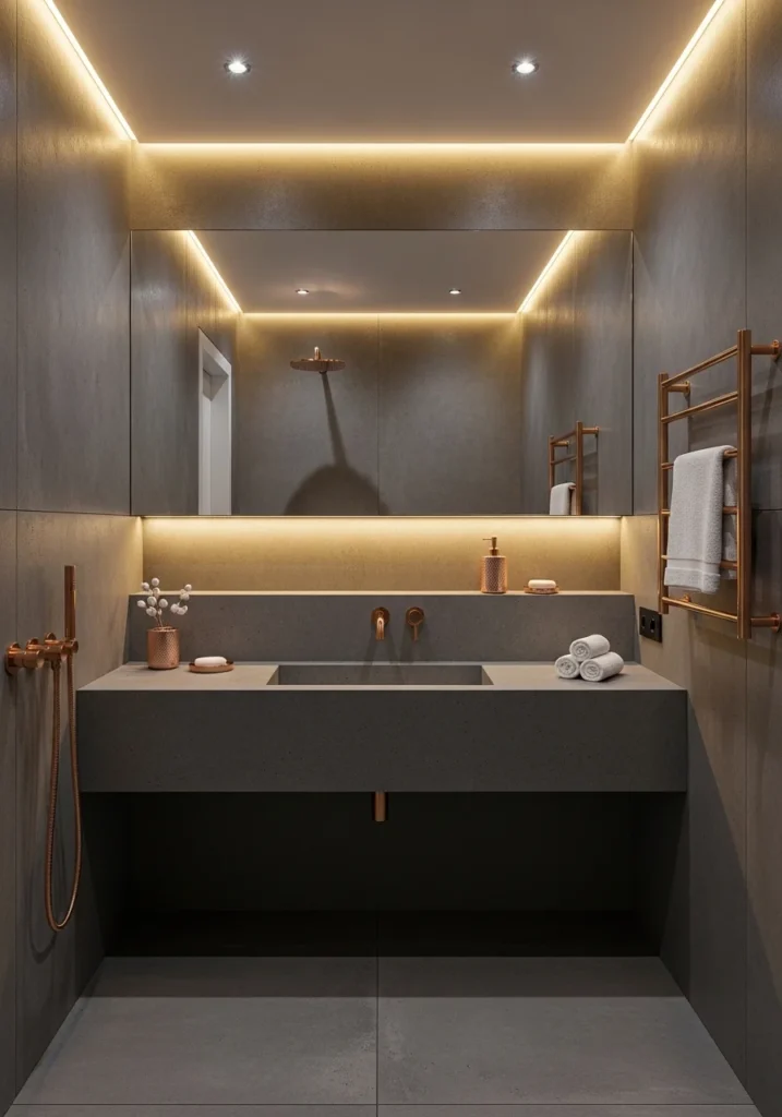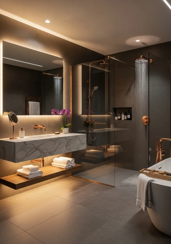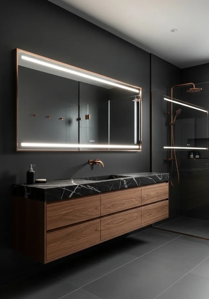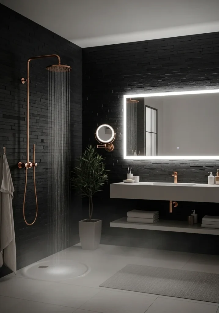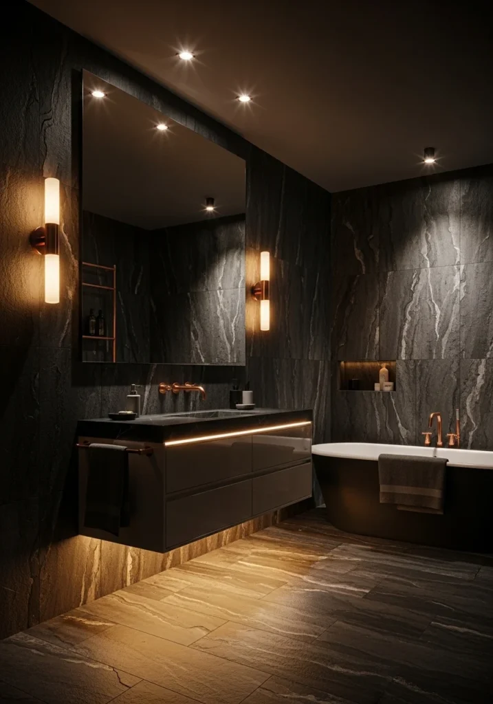 Vanity lighting plays an important role in the design. Elegant rose gold light fixtures positioned beside the mirror cast soft, flattering illumination that highlights the textures of the charcoal tiles. Additional LED strips beneath the vanity provide gentle ambient light that enhances the room’s luxurious feel.