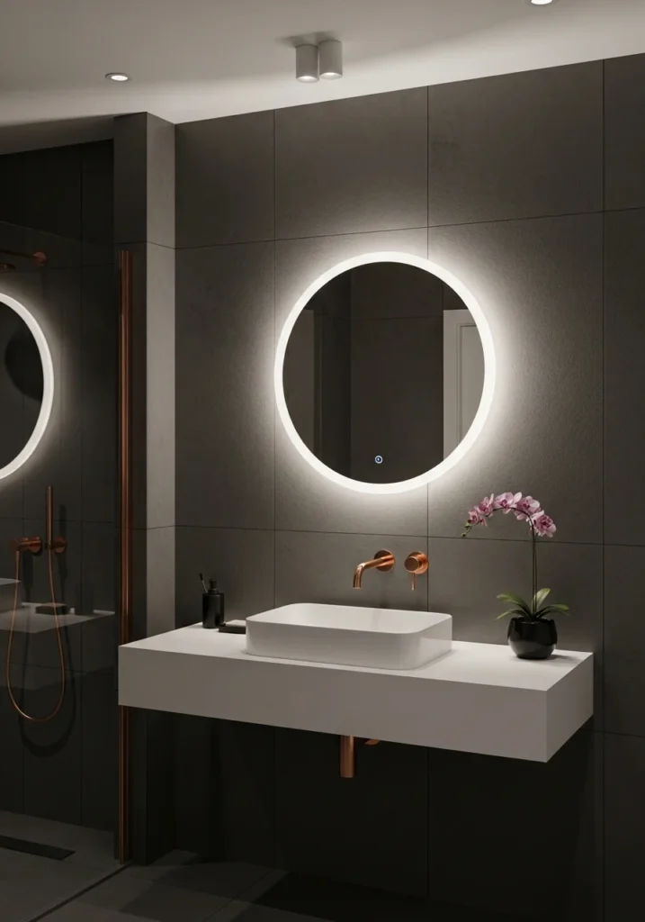 Above the vanity, a circular LED mirror provides both functional lighting and decorative appeal. The soft glow of the mirror highlights the textures of the tiles while reflecting the warm tones of the rose gold fixture.