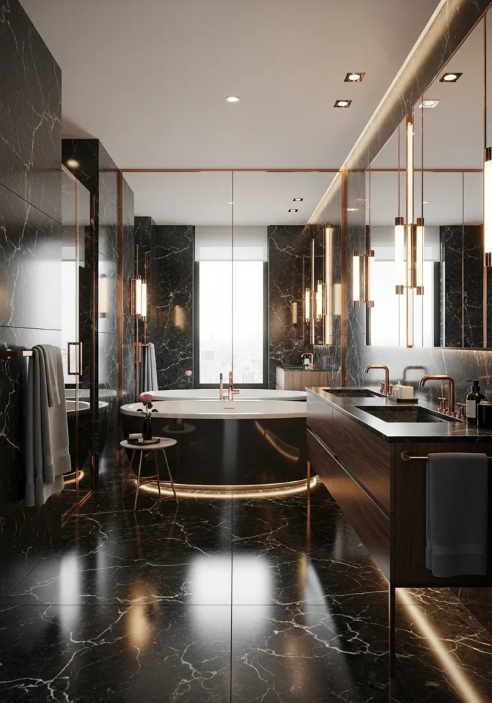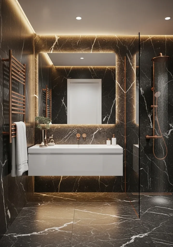 Rose gold fixtures and decorative accents bring warmth to the dark marble environment. Faucets, towel bars, and hardware finished in rose gold add refined metallic highlights that complement the marble’s depth.