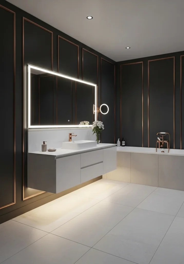 The finished bathroom achieves a perfect harmony between modern simplicity and luxury detailing. Charcoal wall panels provide depth and structure, while rose gold trim introduces warmth and refinement. The result is a sophisticated interior that feels stylish, balanced, and effortlessly luxurious.