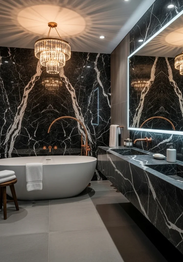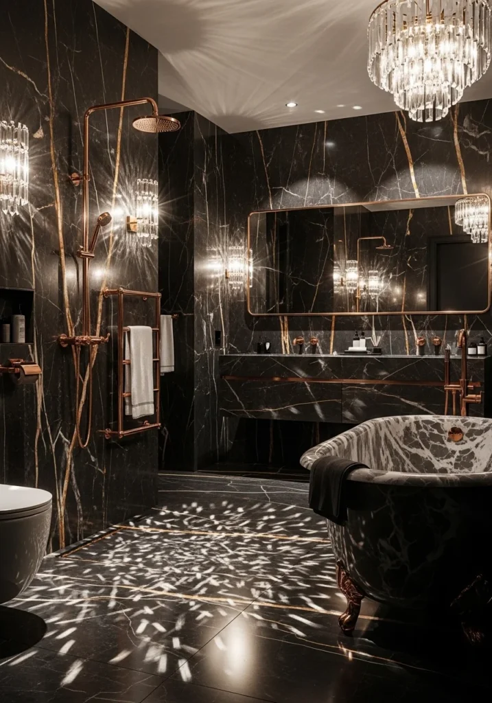 This glamorous bathroom design embraces bold luxury through the combination of charcoal marble and sparkling lighting elements. The marble surfaces display dramatic veining that adds movement and character, creating a visually rich and elegant foundation.