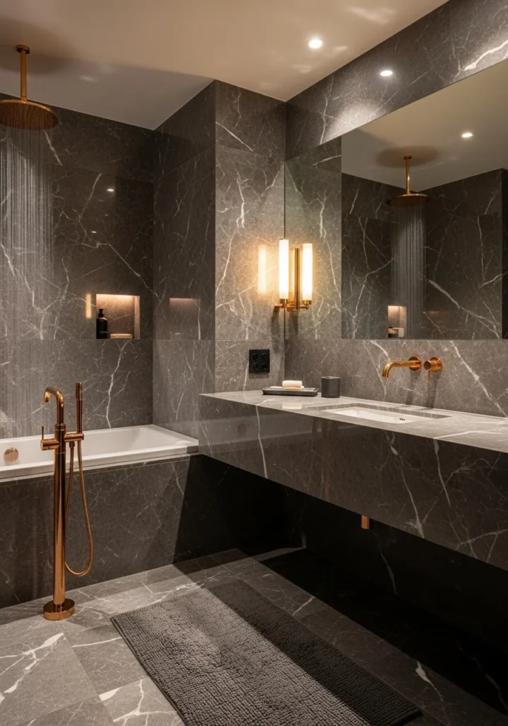 A luxury hotel-inspired bathroom built with charcoal marble surfaces immediately creates a feeling of indulgence and elegance. Large marble slabs cover the walls and floors, displaying subtle natural veining that adds depth and character. The dark charcoal palette establishes a dramatic foundation that allows the warm glow of rose gold accents to stand out beautifully.