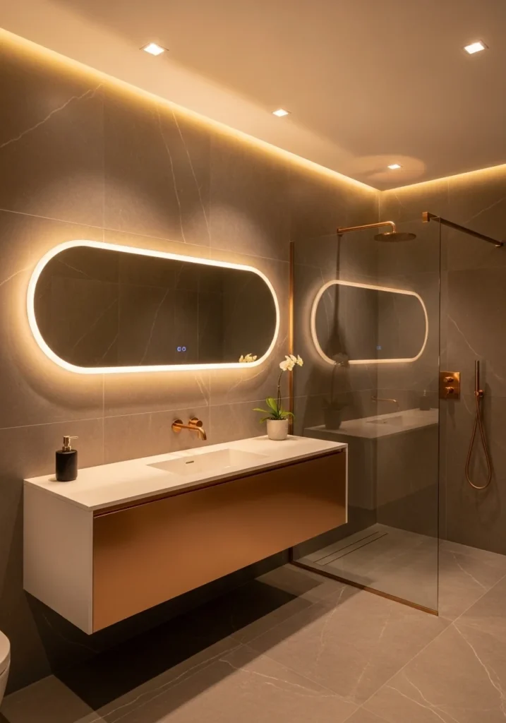 Integrated LED lighting is used to enhance the modern atmosphere. Soft illumination placed behind the mirror and beneath the vanity creates a subtle glow that highlights architectural details. The light gently reflects on the rose gold frame and fixtures, adding warmth and elegance to the overall design.