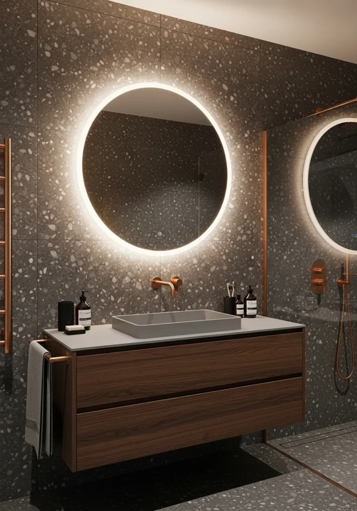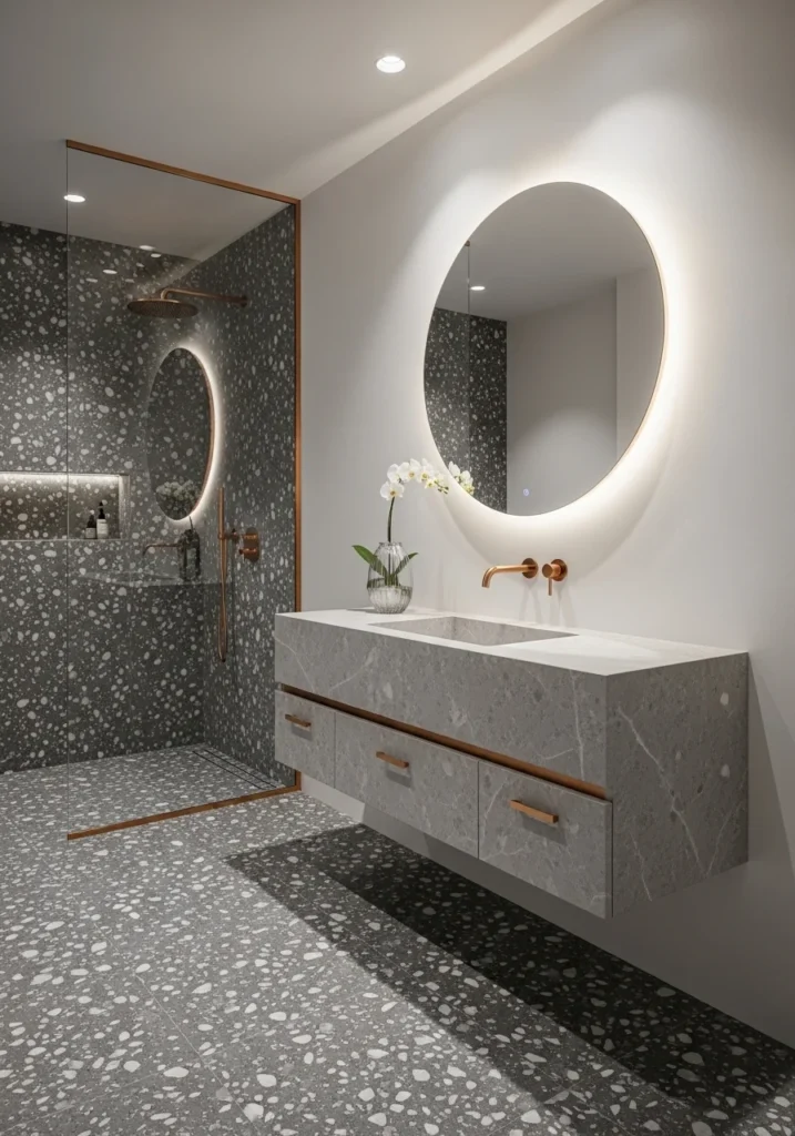 At the center of the vanity wall hangs a large circular mirror framed in elegant rose gold. The metallic frame provides a warm contrast against the darker terrazzo surface, making the mirror a striking focal point. Beneath it, a sleek floating vanity maintains a minimalist appearance while offering functional storage.