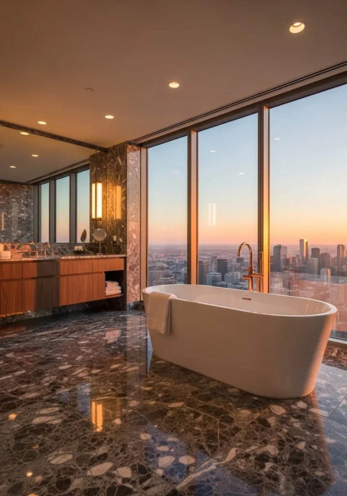 The freestanding bathtub becomes the visual centerpiece of the space. Positioned near a large window or feature wall, the bathtub is paired with a sleek rose gold tub filler that adds warmth and elegance. The polished metallic finish reflects light beautifully against the dark marble surfaces.