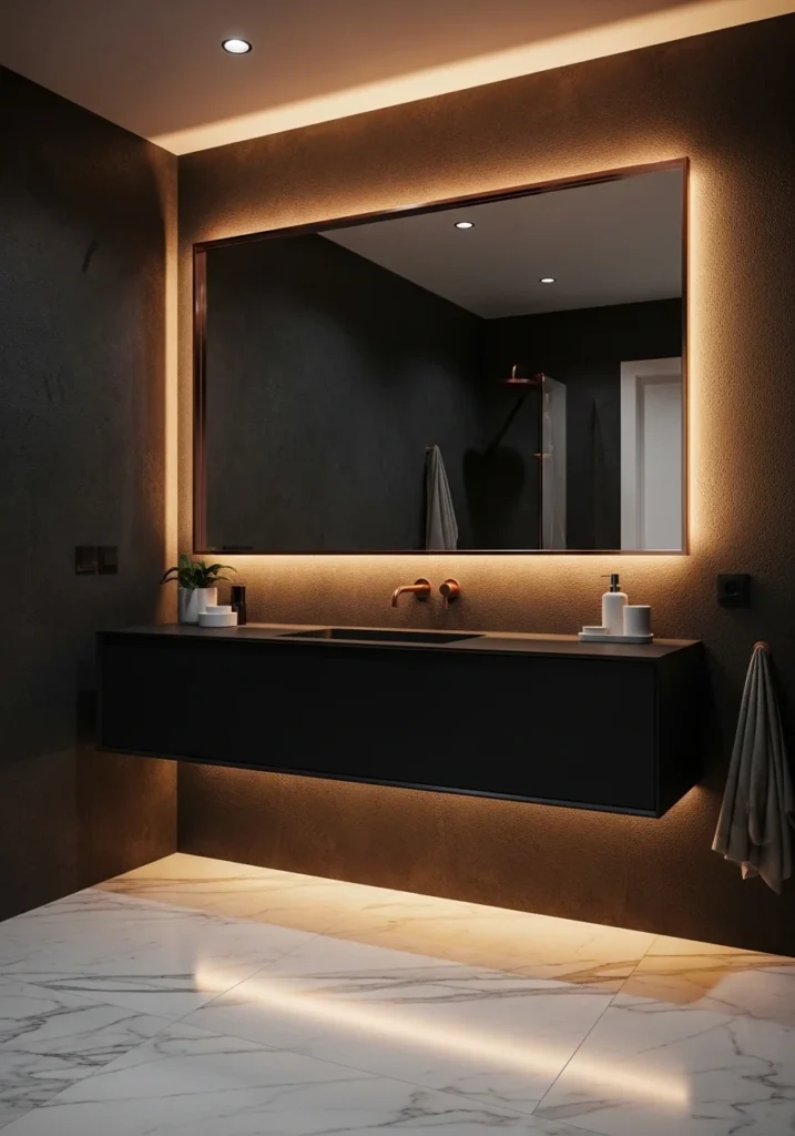Lighting is thoughtfully layered to enhance both function and atmosphere. Warm LED strips hidden beneath the vanity and behind mirrors create a soft glow that gently illuminates the charcoal textures. Wall-mounted rose gold sconces add an additional level of sophistication while casting flattering ambient light throughout the room.