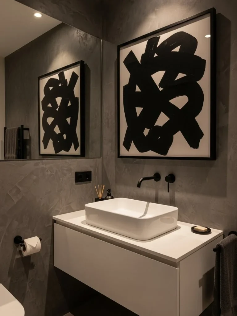 The bathroom feels modern, curated, and stylish. Charcoal gray and white elements are balanced with artistic accents to produce a visually captivating space.