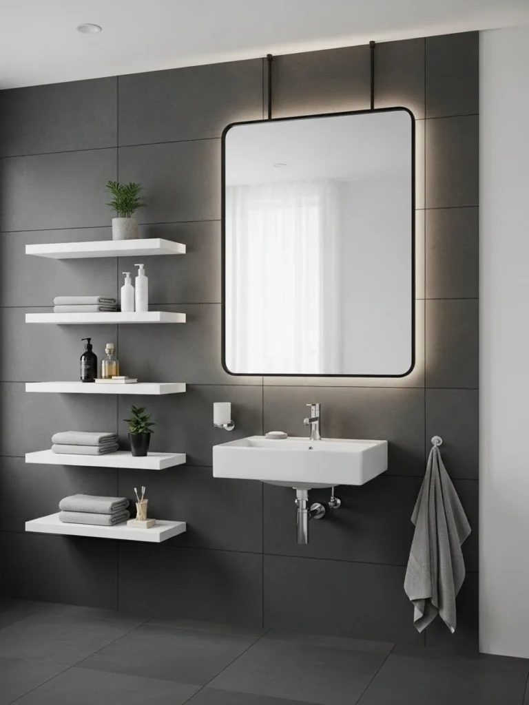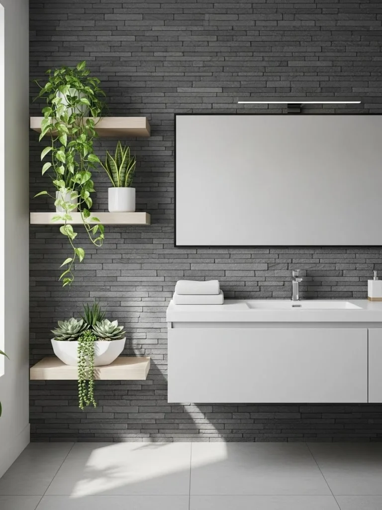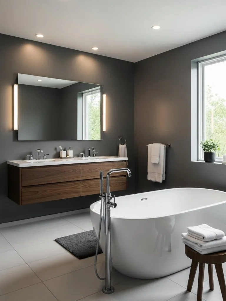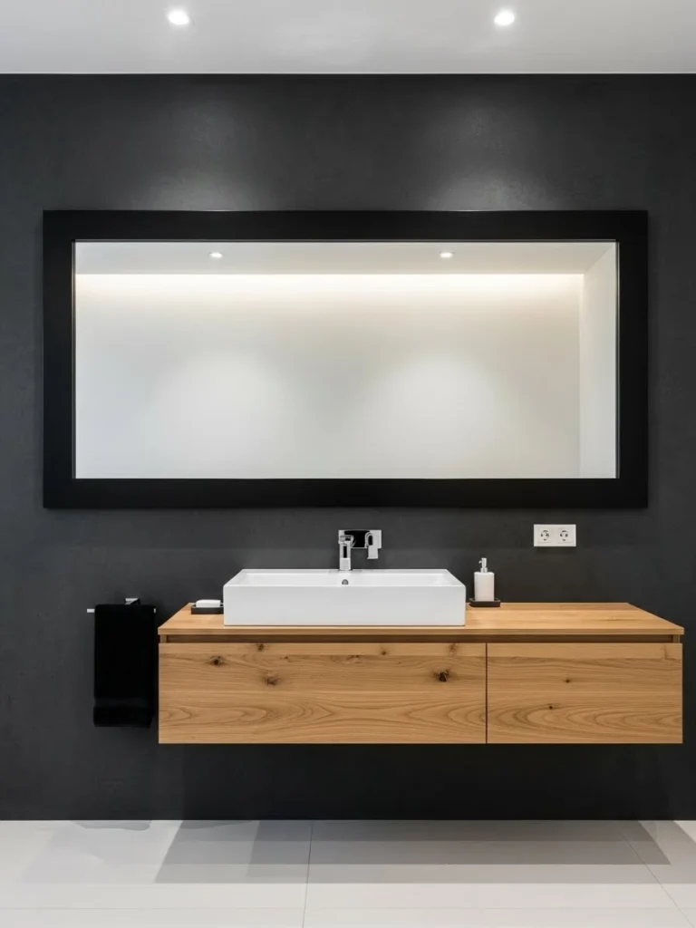 The flooring is subtle, often light gray, ensuring the dark wall and mirror remain focal points. Small décor like plants or soap dishes provide warmth.
