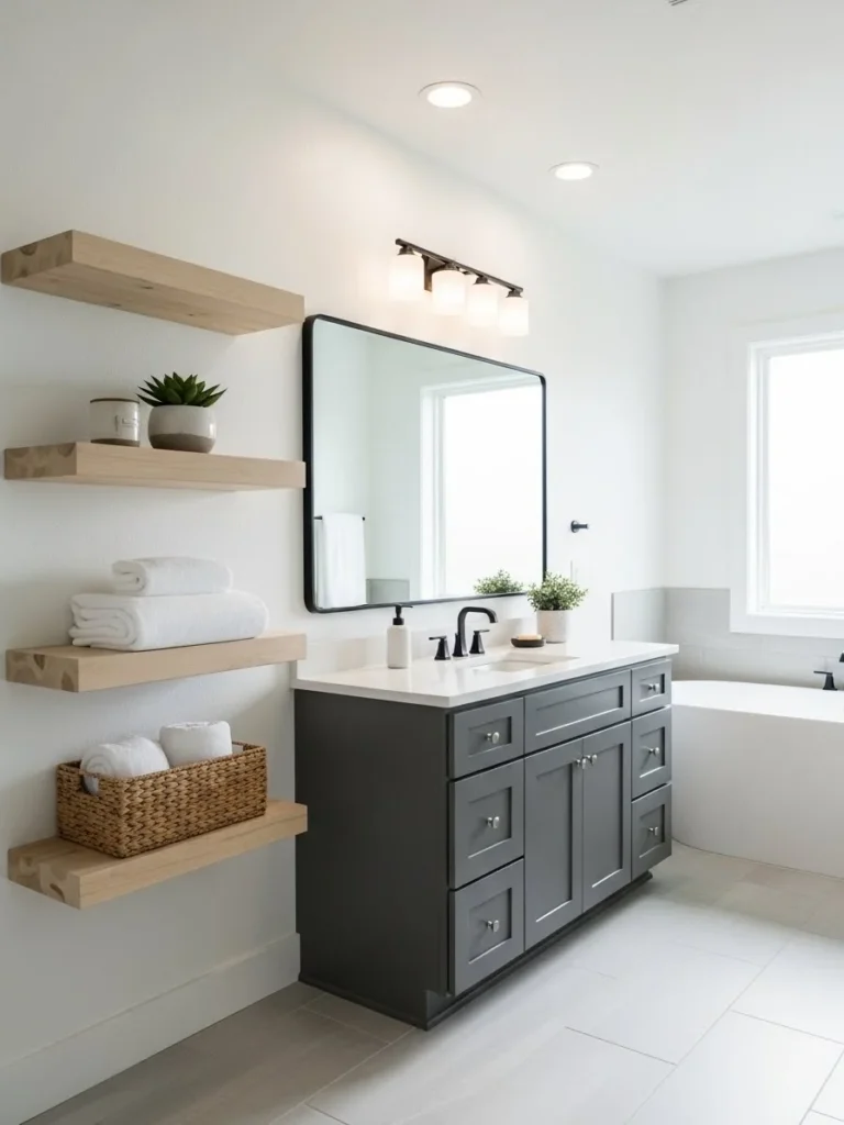 White floating shelves and a compact charcoal gray vanity maximize storage in this small bathroom. The arrangement keeps surfaces uncluttered and functional.