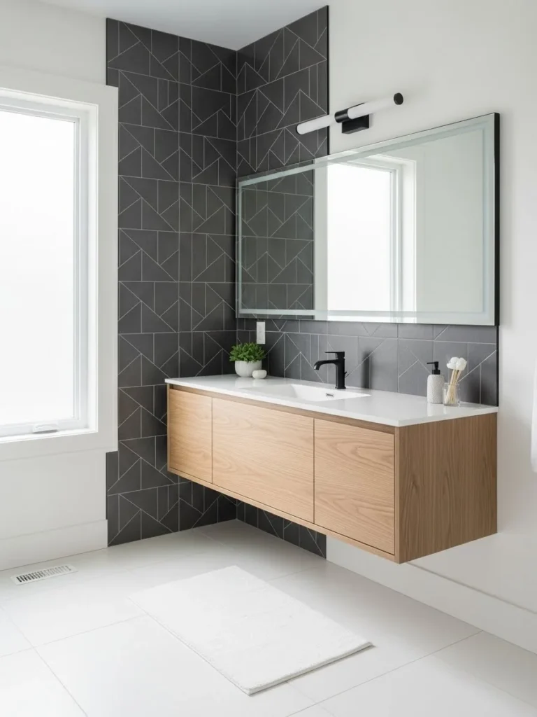 The space is contemporary and stylish, with a strong design statement achieved through the contrast of geometric charcoal gray tiles against white walls.