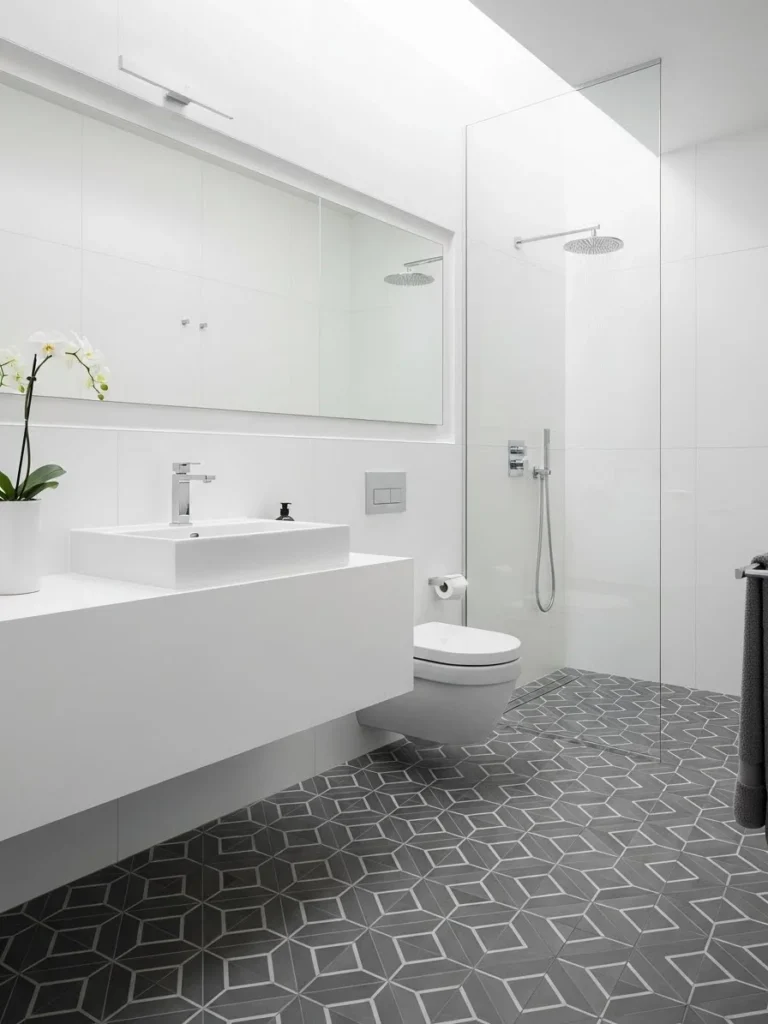White walls serve as a crisp backdrop for charcoal gray geometric patterned floor tiles. The shapes create visual interest and modern elegance.