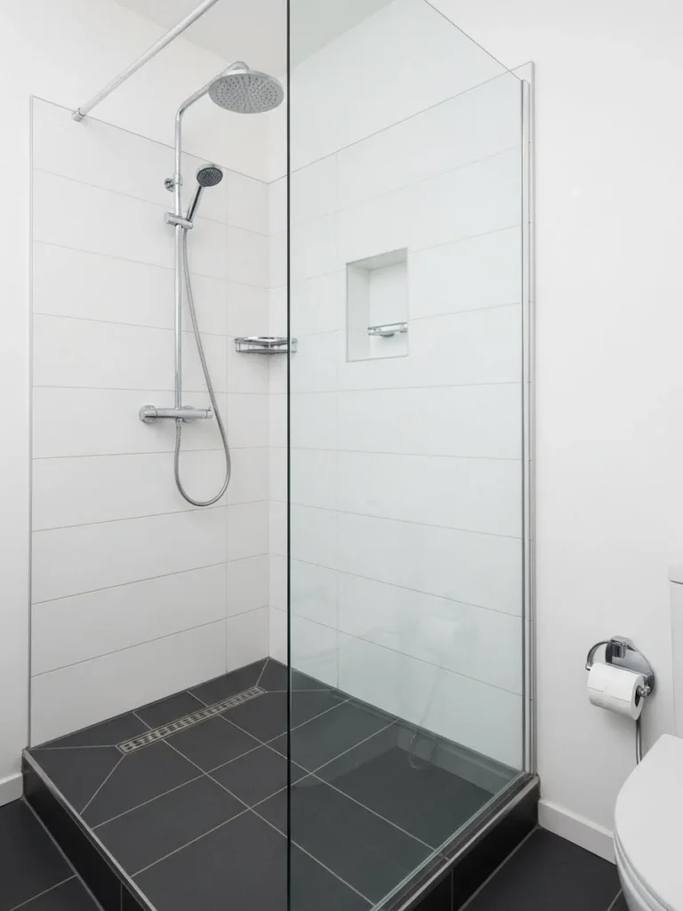 Charcoal gray tiles line a small shower area, creating depth and visual interest in a confined space. White walls keep the room bright and clean.