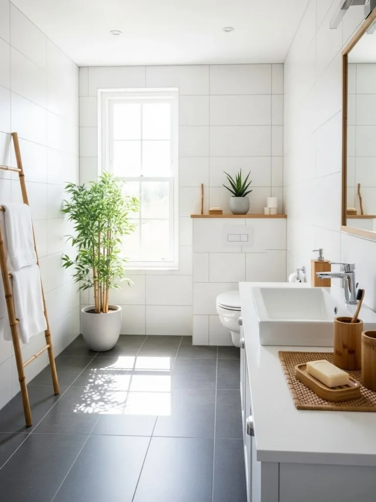 Green indoor plants add life and freshness, emphasizing the natural, relaxing vibe of the space. Wood accents, such as shelves or bath mats, add warmth.