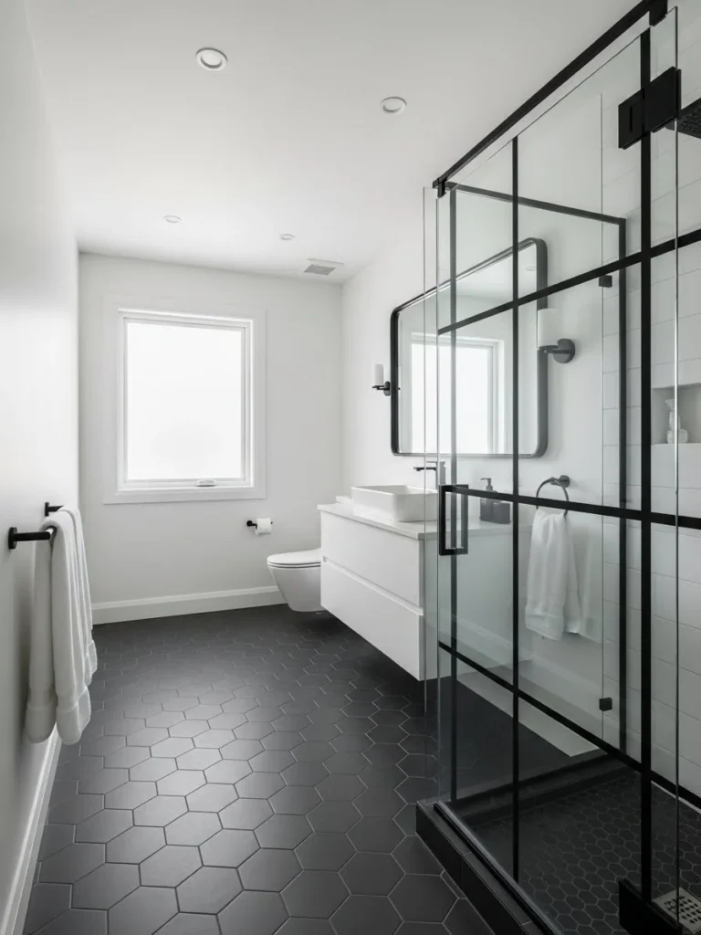 White walls provide a crisp backdrop for charcoal gray hexagonal floor tiles, adding geometric interest and visual depth. The black metal-framed glass shower enclosure creates a bold focal point.