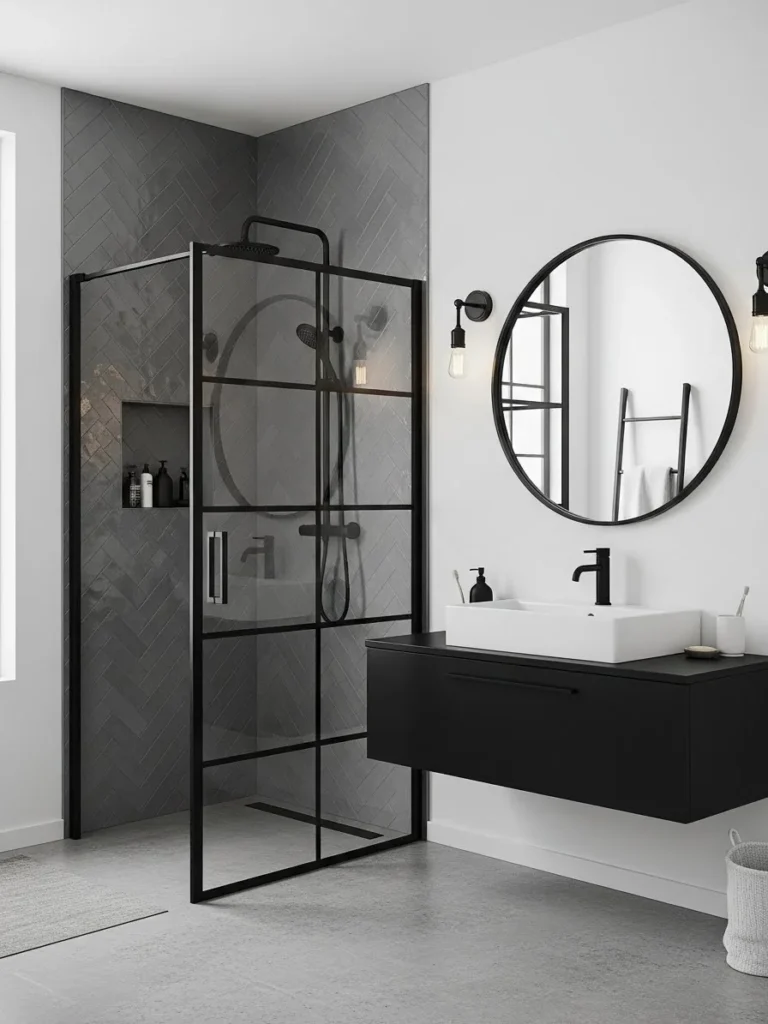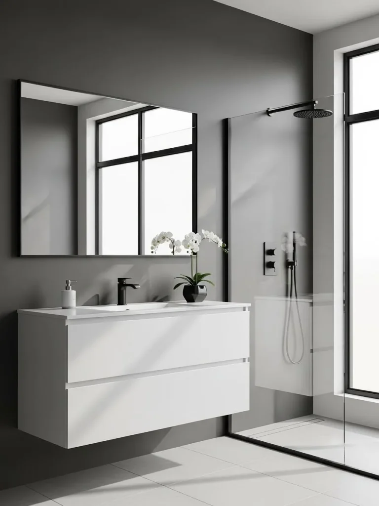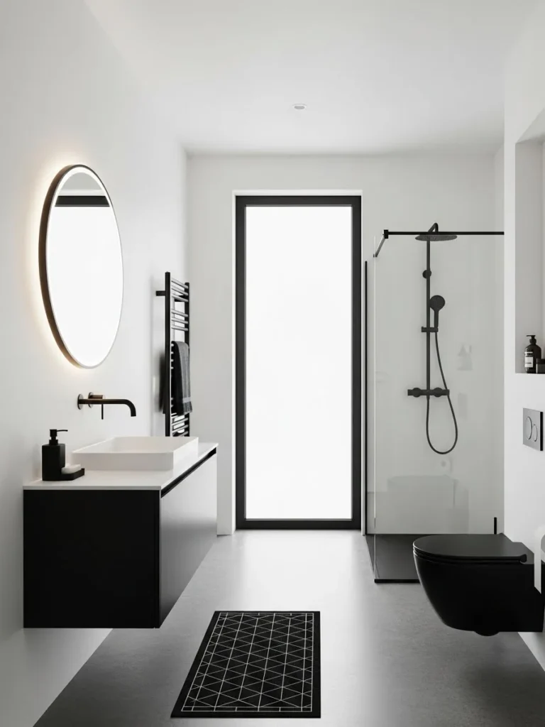 A minimalist vanity, usually white or light wood, keeps the space uncluttered. Black fixtures provide subtle contrast and cohesion.