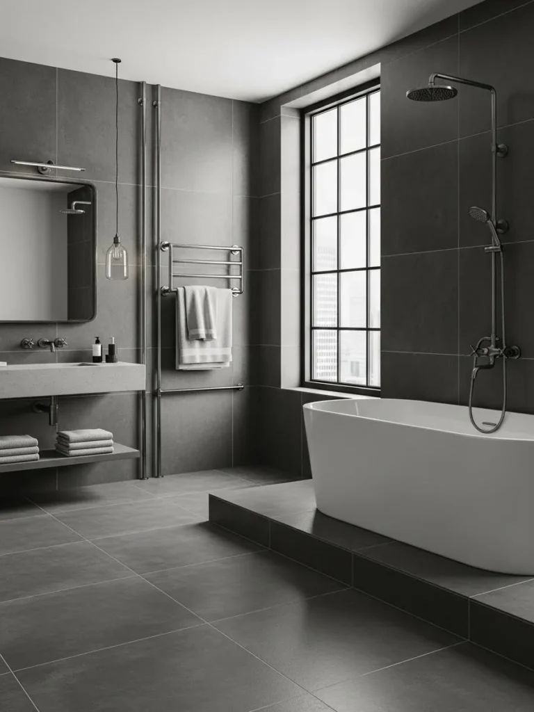 The bathroom balances edgy industrial elements with modern elegance, producing a stylish, loft-inspired retreat perfect for relaxation.