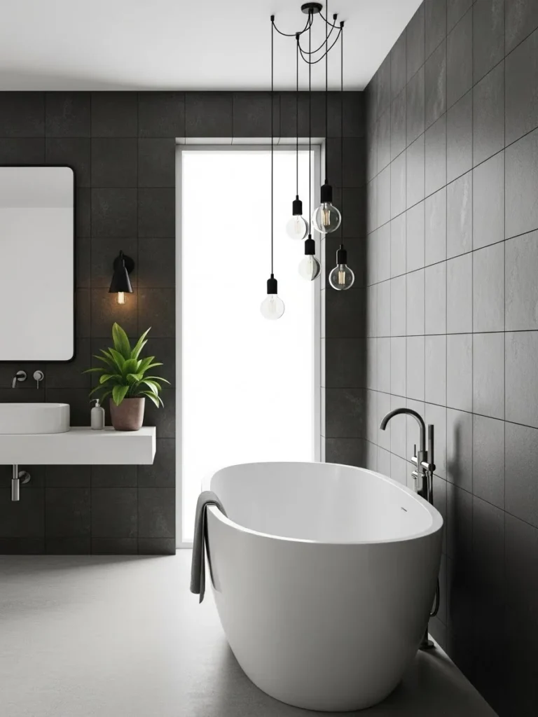 Charcoal gray tiles cover the walls, forming a sleek, uniform backdrop that anchors the space. A white freestanding bathtub serves as the centerpiece, offering luxury and visual contrast.