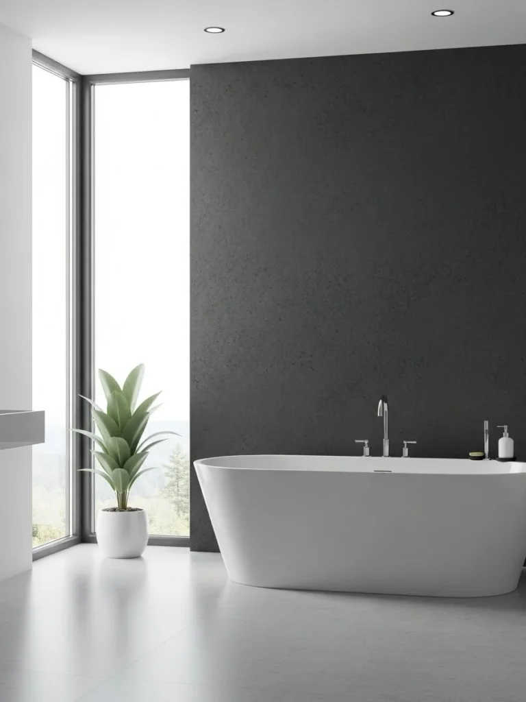 A charcoal gray textured wall forms a dramatic backdrop for a white freestanding tub. The contrast emphasizes simplicity and modern elegance.