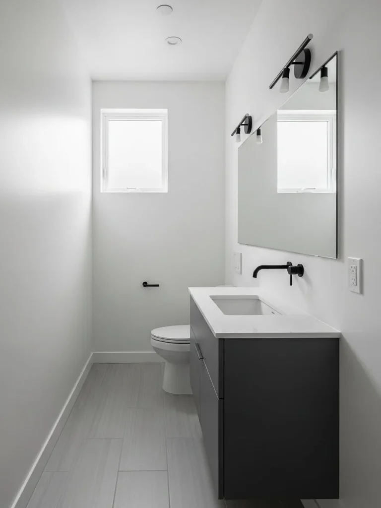 This narrow bathroom features white walls to maximize brightness, with a charcoal gray vanity providing contrast and elegance.