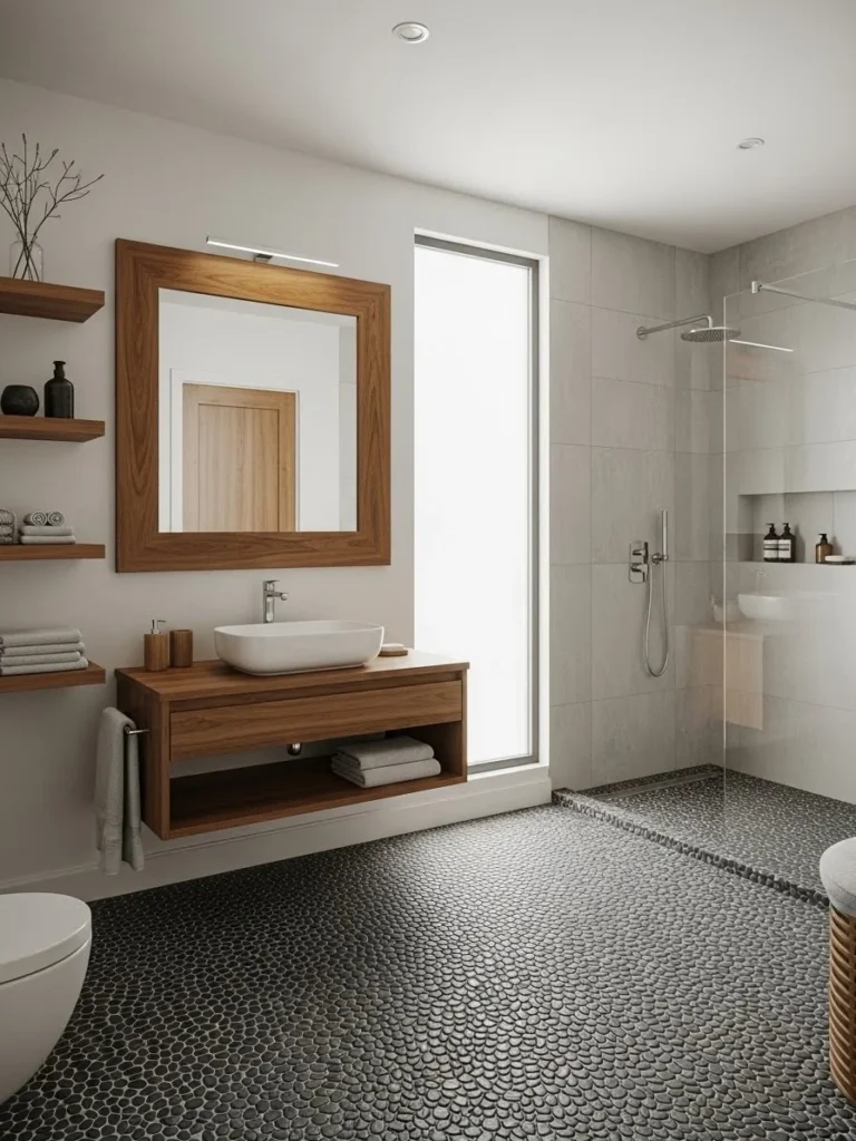 Subtle wooden accents, such as floating shelves or bath mats, enhance warmth and comfort without disrupting the modern look.