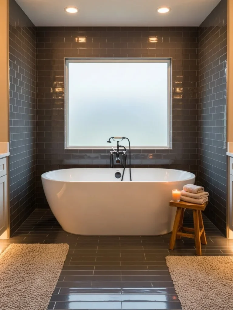 Minimalist fixtures in black or matte metal keep the focus on the tub and maintain a modern look. Soft lighting enhances textures and highlights curves.
