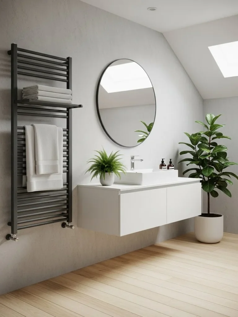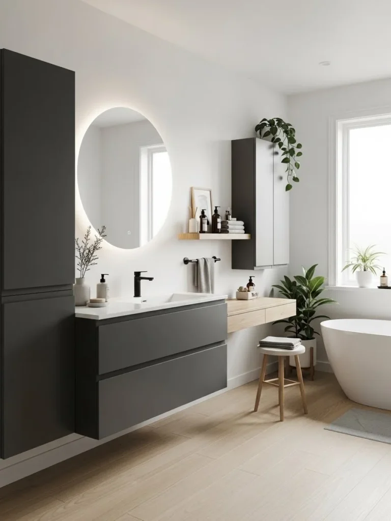 Overall, the bathroom achieves a balance of modern simplicity and Scandinavian coziness. Charcoal gray, white, and natural elements create a serene spa-like retreat.