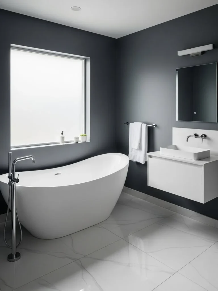 Charcoal gray walls create a bold, contemporary statement, paired with a pristine white bathtub for contrast. Polished chrome fixtures add a touch of modern elegance.