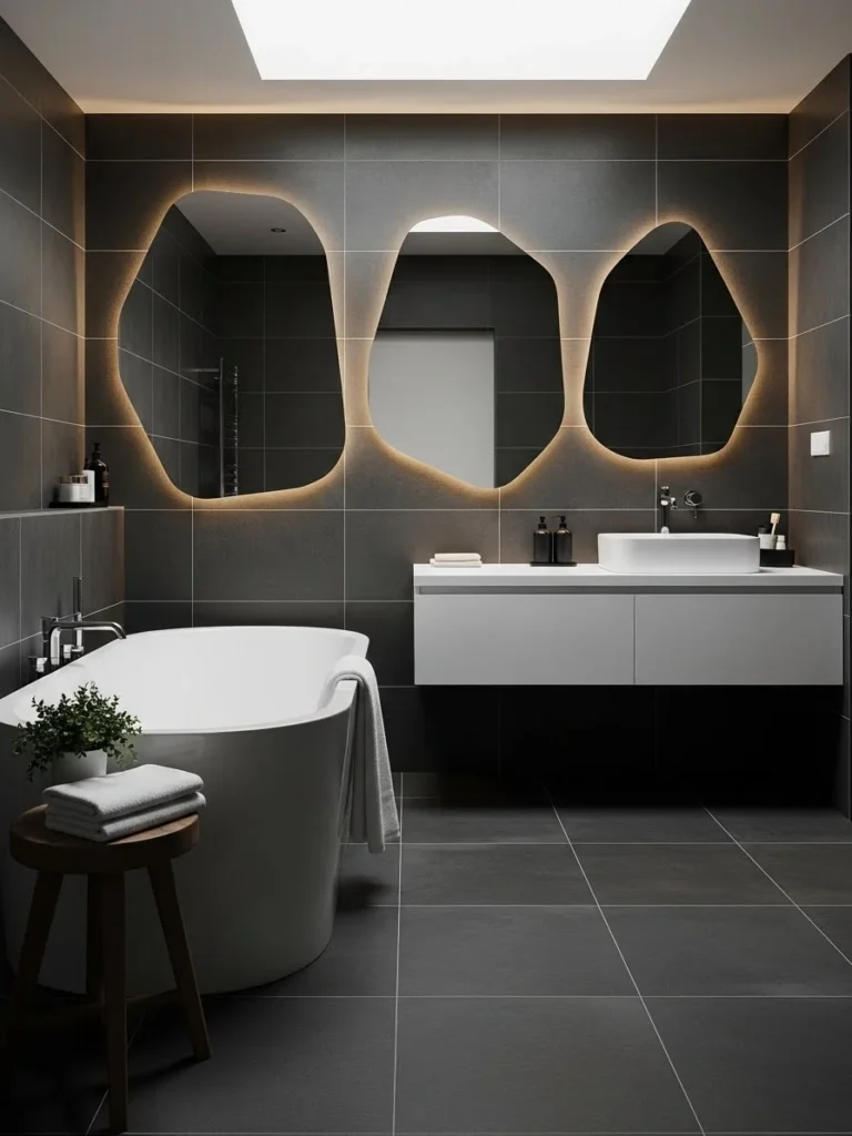 Geometric mirrors above the sink add a sculptural, artistic touch, reflecting light and creating depth. Minimalist lighting enhances the modern aesthetic.