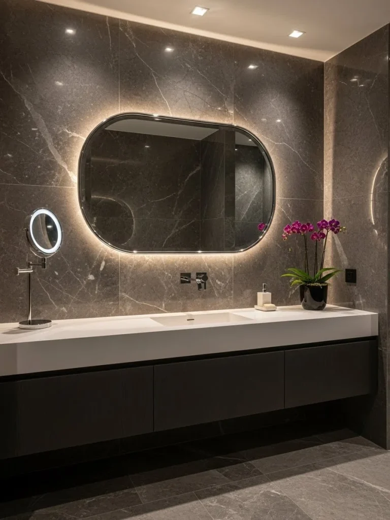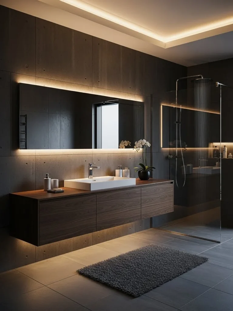 A floating vanity with sleek cabinetry ensures functionality without sacrificing style. Subtle LED lighting highlights the textures of the walls and floors, adding warmth to the darker palette. Minimal decor preserves a clean and uncluttered appearance.