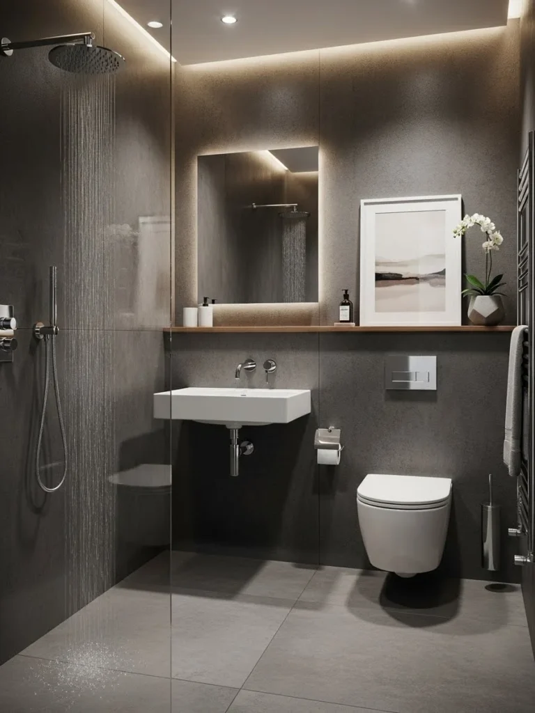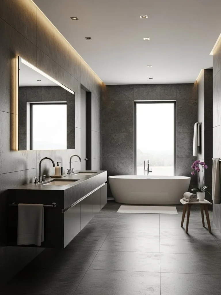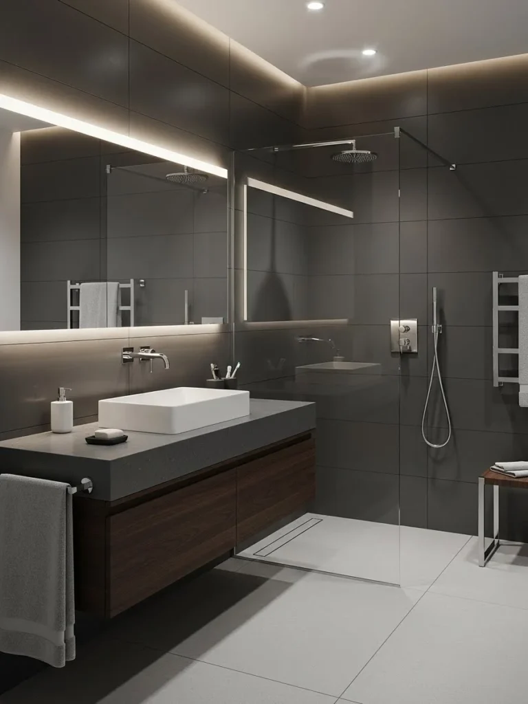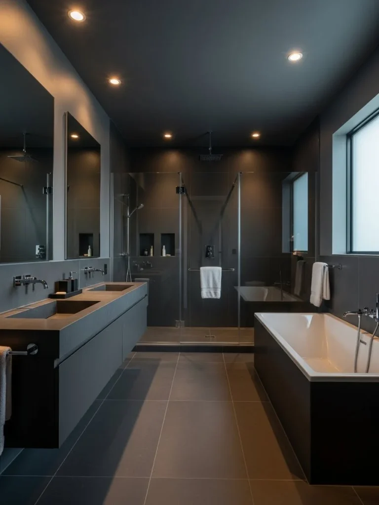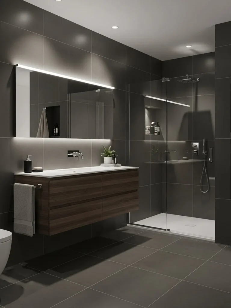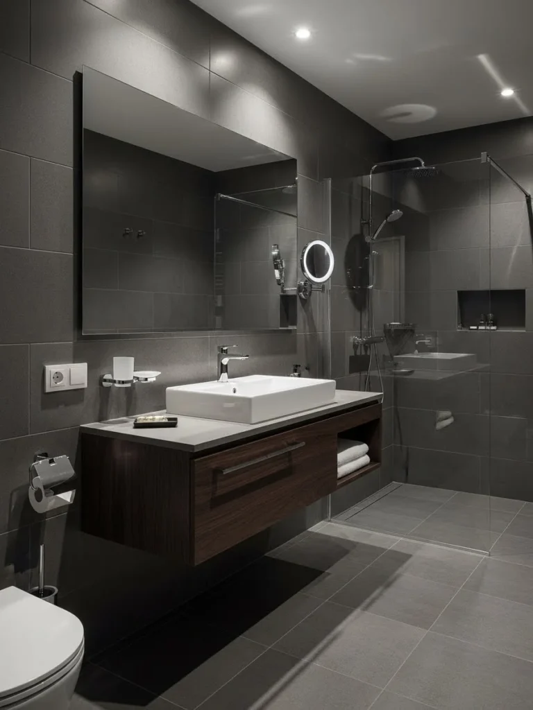 This modern minimalist bathroom balances practicality with elegance, offering a luxurious retreat in any home. The combination of deep gray textures, chrome accents, and thoughtful lighting creates a sophisticated space that is both stylish and inviting.