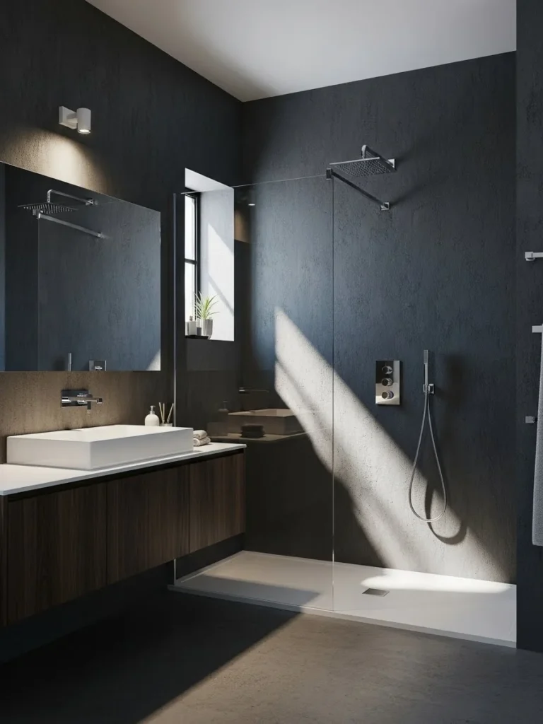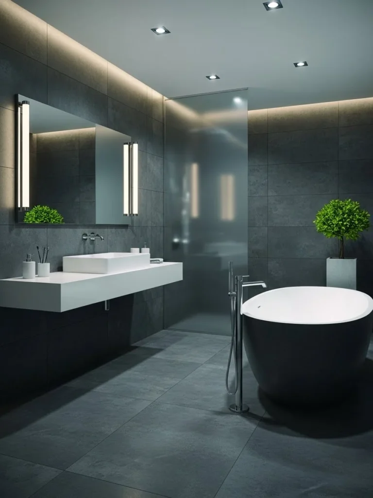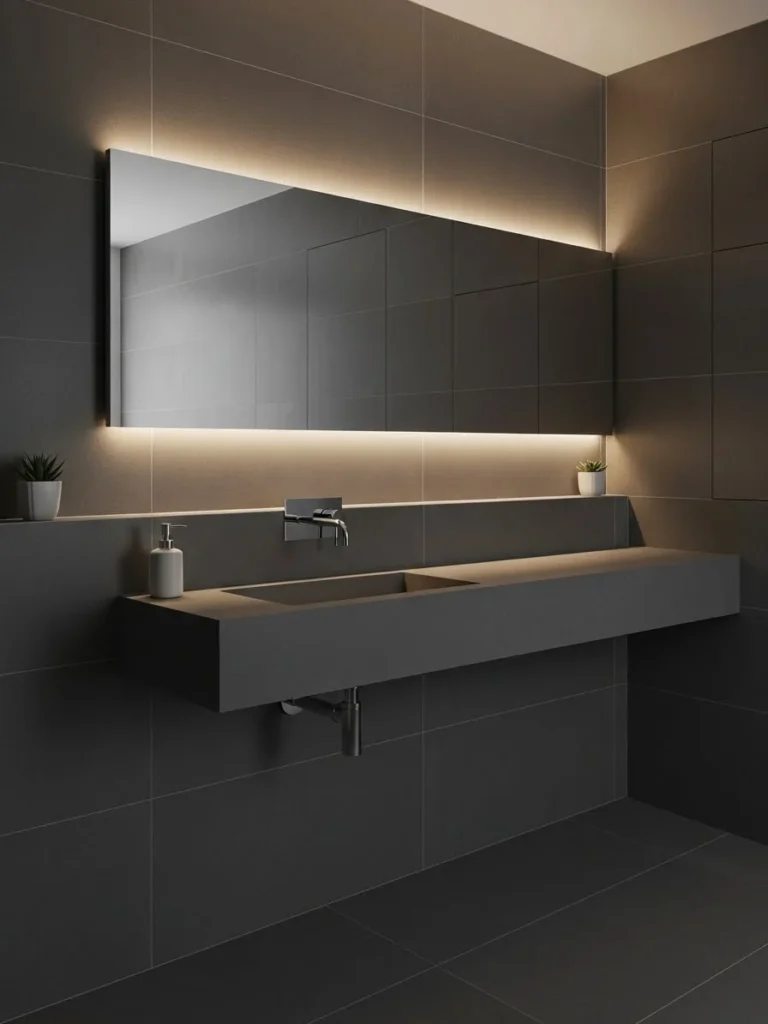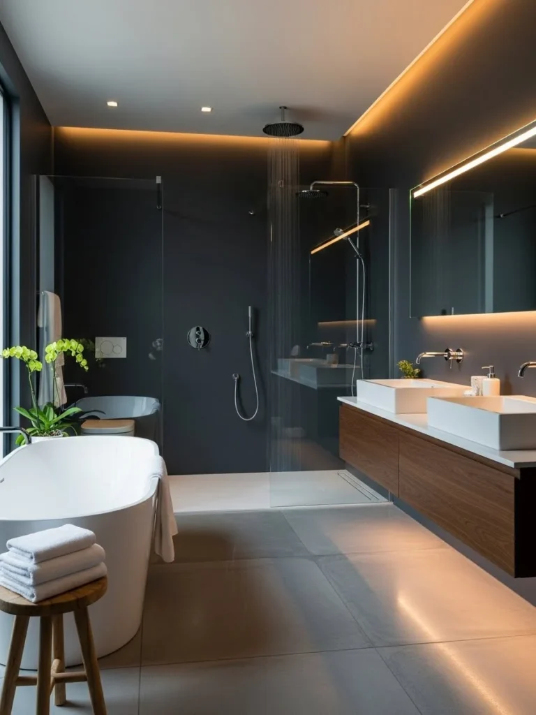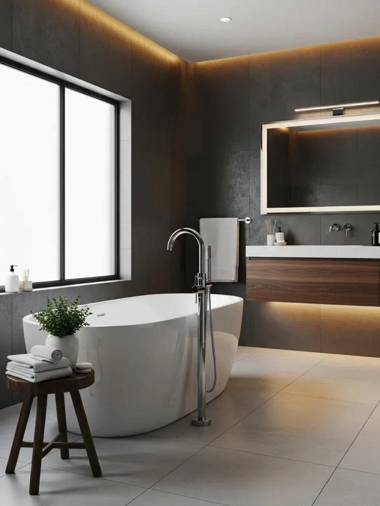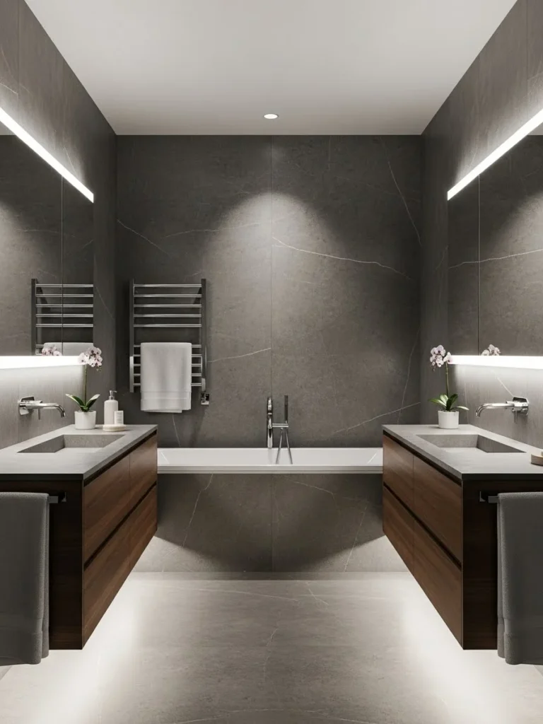 This modern minimalist bathroom balances practicality with elegance, offering a luxurious retreat in any home. The combination of deep gray textures, chrome accents, and thoughtful lighting creates a sophisticated space that is both stylish and inviting.