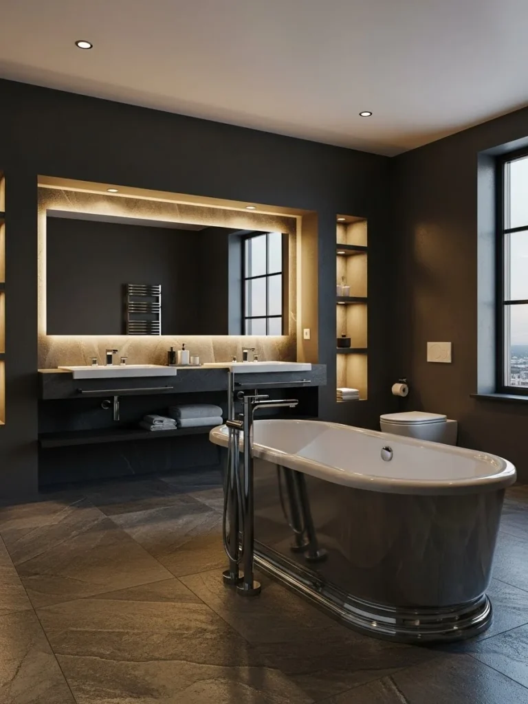 This elegant bathroom features deep gray walls and chrome mirror accents, creating a luxurious and modern aesthetic. The dark gray tones provide depth and sophistication, while chrome elements reflect light, enhancing brightness and visual appeal throughout the space.