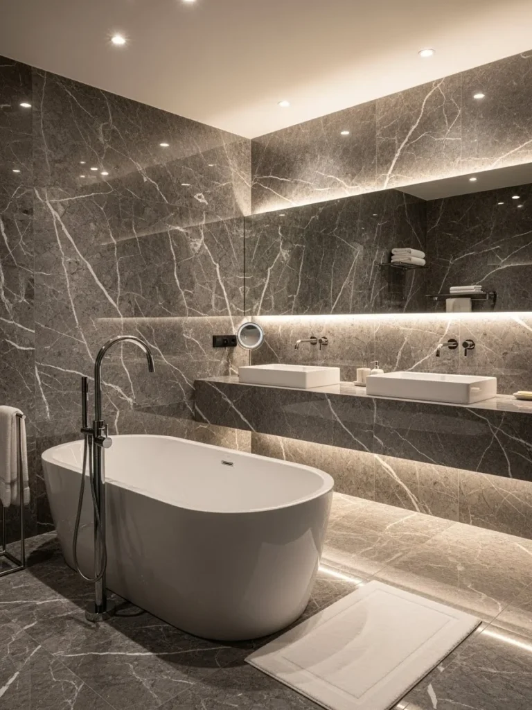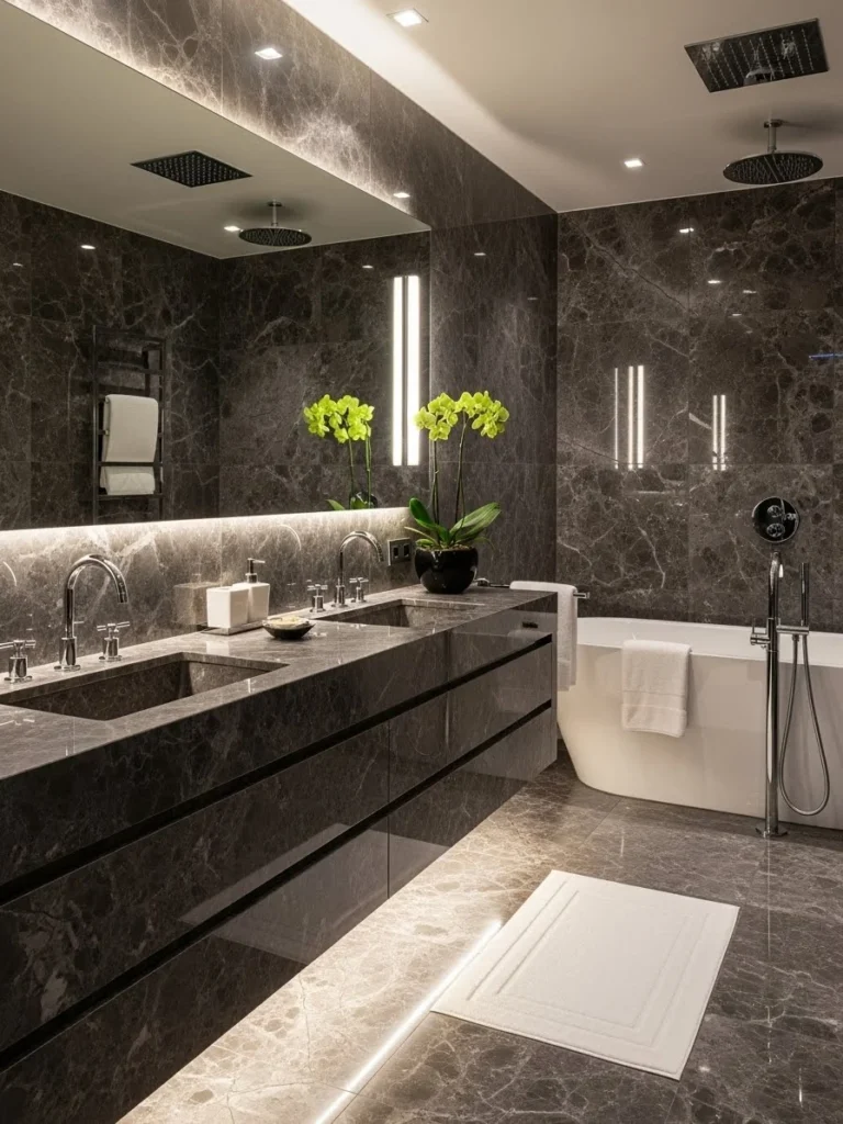 Luxury Modern Bathroom With Deep Gray Marble Slabs