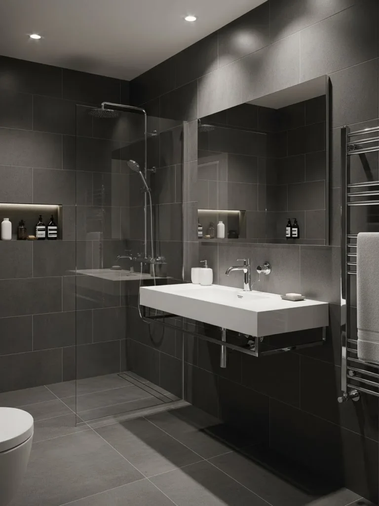 This contemporary bathroom interior uses deep gray tiles and chrome accents to achieve a sleek, modern look. Large-format tiles on walls and floors create a sense of continuity and sophistication. Chrome fixtures, including faucets, showerheads, and towel racks, provide a polished contrast to the dark gray surfaces.