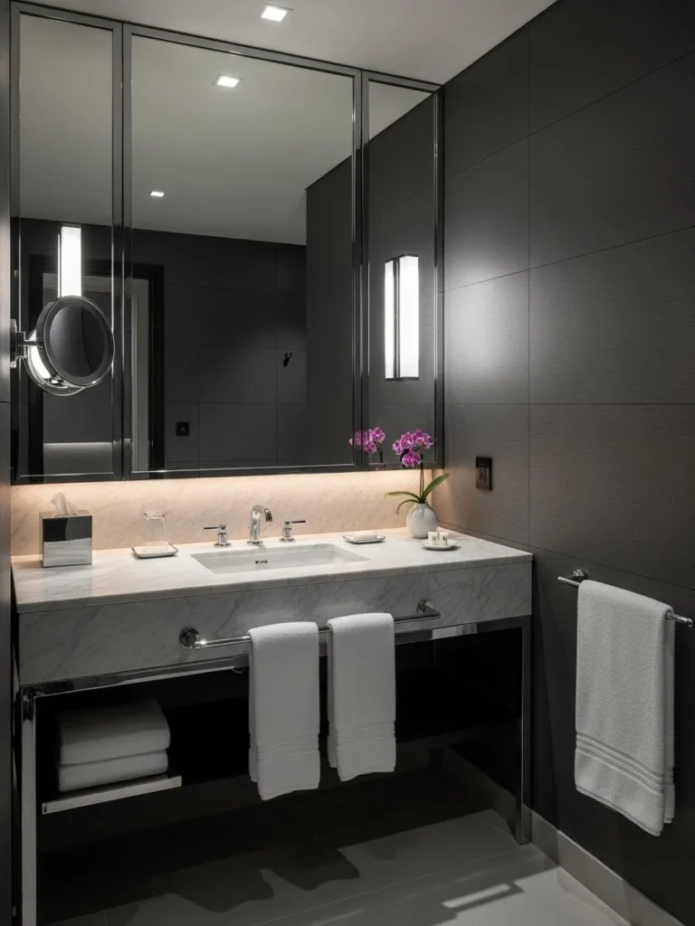 Modern Hotel Style Bathroom With Deep Gray Tones