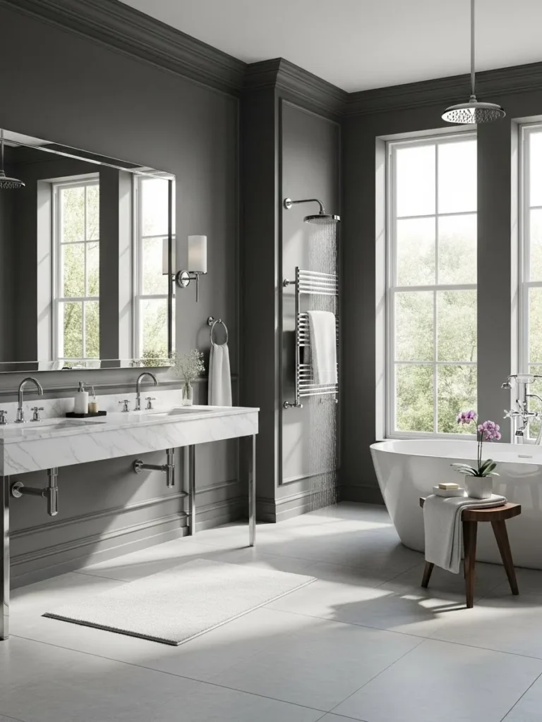 This high-end bathroom features charcoal gray walls paired with polished chrome fixtures, creating a refined, contemporary look. The deep gray tones provide depth and elegance, while chrome faucets, towel bars, and mirrors reflect light to brighten the space.