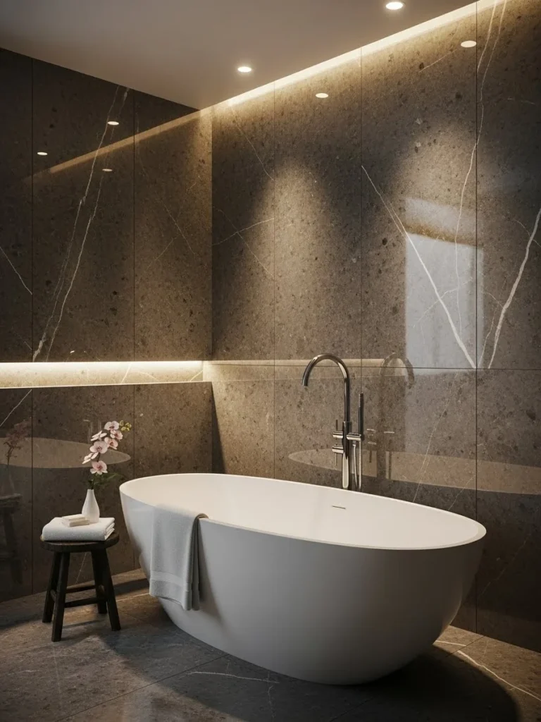 The bathtub serves as the focal point, offering a spa-like retreat. A floating vanity with integrated storage complements the design while maintaining clean lines. Ambient lighting highlights the natural textures of the tiles and the polished chrome finish.